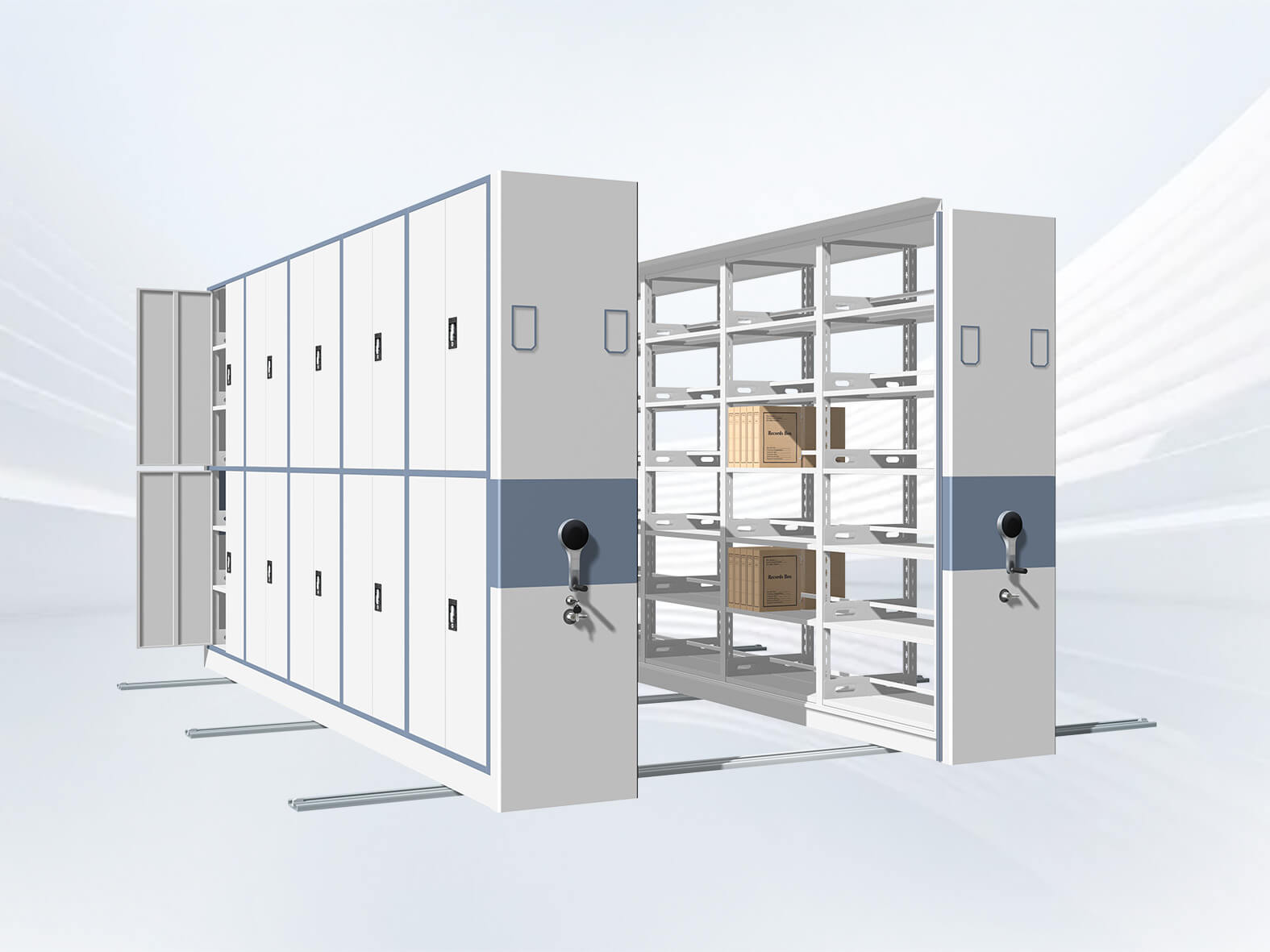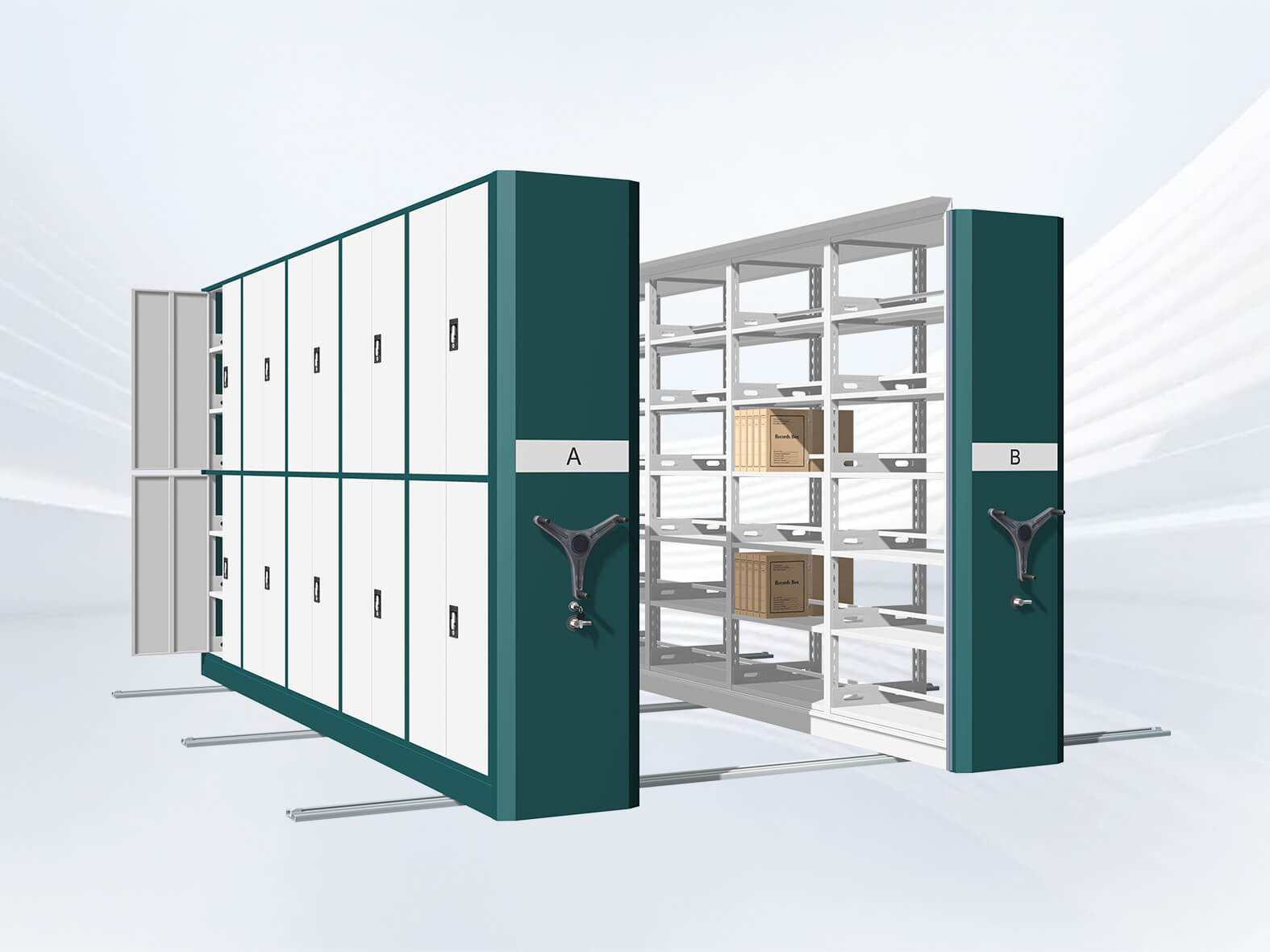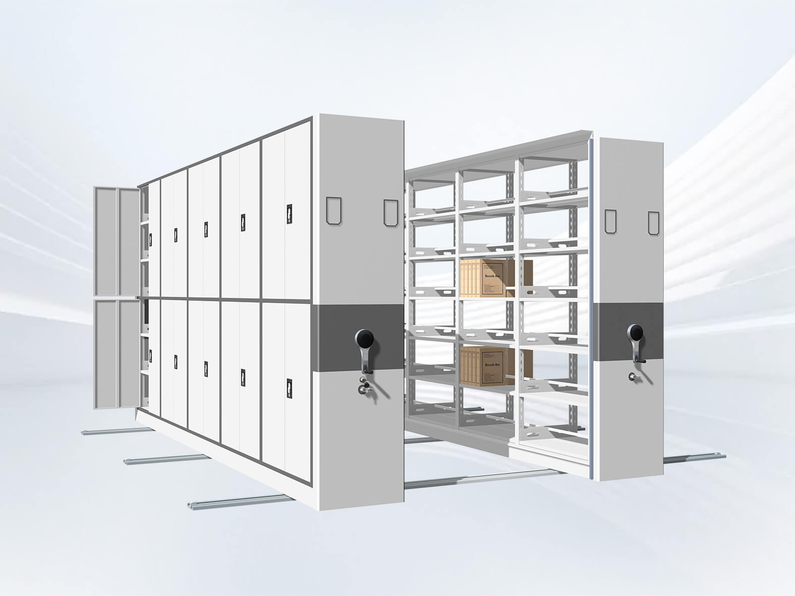 Передвижные стеллажи с ручным приводом, также известные как ручные передвижные стеллажи, представляют собой систему хранения архивных материалов высокой плотности, разработанную для максимального использования пространства и повышения эффективности управления документами. Каждая стеллажная секция установлена на подвижных каретках, которые плавно перемещаются по напольным направляющим. Поворачивая рукоятку, пользователи могут легко перемещать стеллажи, открывая проход только там, где это необходимо, устраняя стационарные проходы и значительно сокращая неиспользуемое пространство на полу.